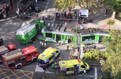 Siete heridos al chocar un tranvía con un camión de la limpieza en Bilbao España