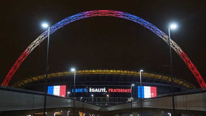Los dirigentes ingleses interpretaron de inmediato la intención y dispusieron una serie de medidas para homenajear a Francia: el gigantesco arco que corona el estadio de Wembley estuvo iluminado anoche con los colores de la bandera francesa y en las pantallas se podía leer Liberté, Égalité, Fraternité.