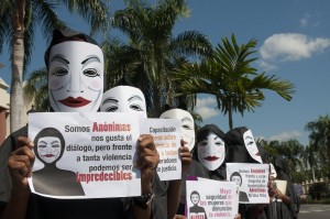 RD-SANTO DOMINGO, República Dominicana.- Representantes de organizaciones de mujeres bajo el símbolo de “Anónimas” se manifestaron este martes frente al Palacio Nacional, en contra del creciente número de feminicidios.