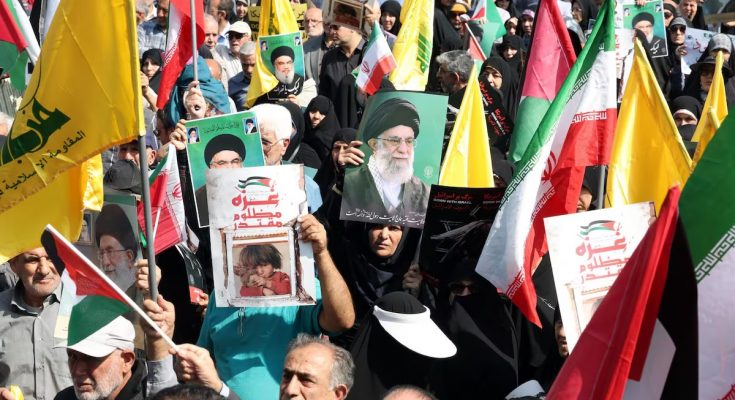 Los manifestantes ondeaban las banderas de Irán, Palestina e Hizbulá, que junto al grupo palestino de Hamás y los hutíes de Yemen, entre otros, conforman la alianza antiisraelí ‘Eje de la Resistencia’, capitaneada por Teherán.